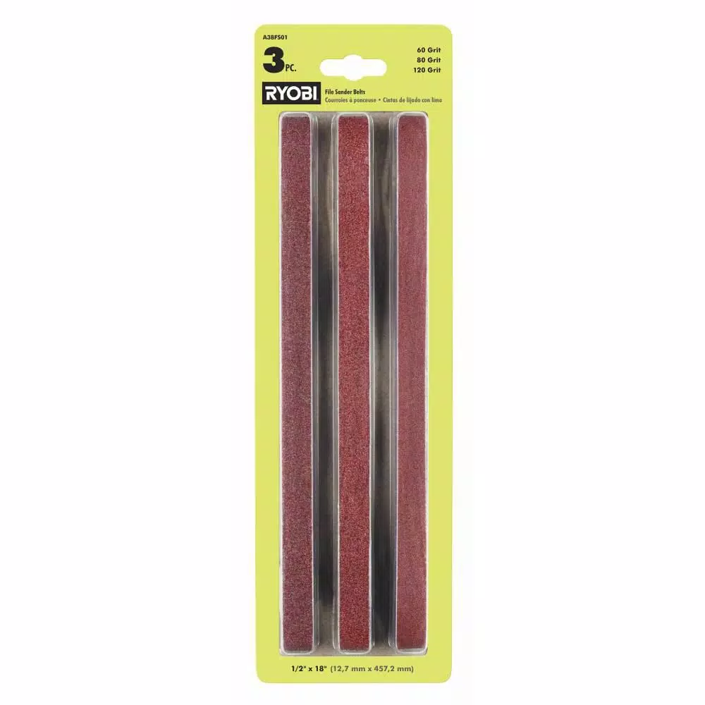 The RYOBI File Sander Belts (3-Pack) are compatible with the RYOBI 18V ONE+ Cordless 1/2 in. x 18 in. Belt Sander. The aluminum oxide blend provides longer life and increased durability. This 3-Pack package comes with a 60 grit, 80 grit, and 120 grit file sander belt, for a variety of applications. For use with wood, metal, and plastic.